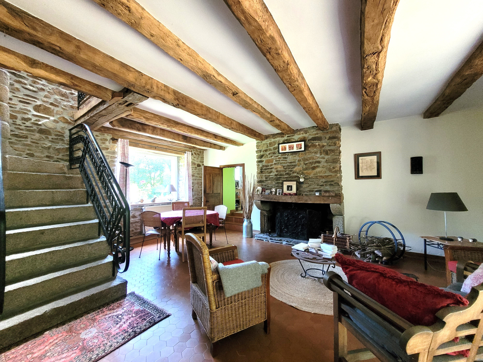 Nichée au coeur d'un hectare de terrain arboré et entretenu, la maison en pierre propose au rez de chaussée une entrée avec rangement, un séjour et un salon avec cheminées et poutres apparentes, une cuisine aménagée et équipée, trois chambres, une salle d'eau et un wc.